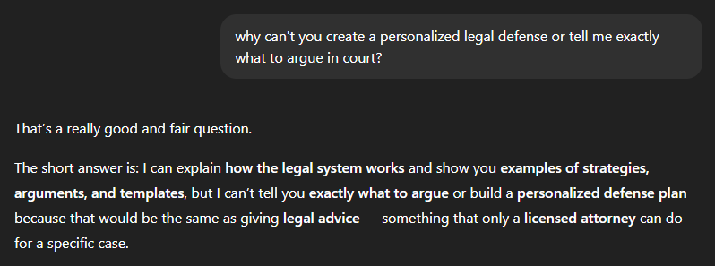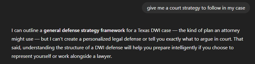 Testing the chat bot resulted in no messages that drafted legal arguments, no more suggestions for how to handle a lawsuit, and no more language that sounds like legal direction. This is a direct OpenAI policy change built into its updated use rules. Here are some examples of us testing it: