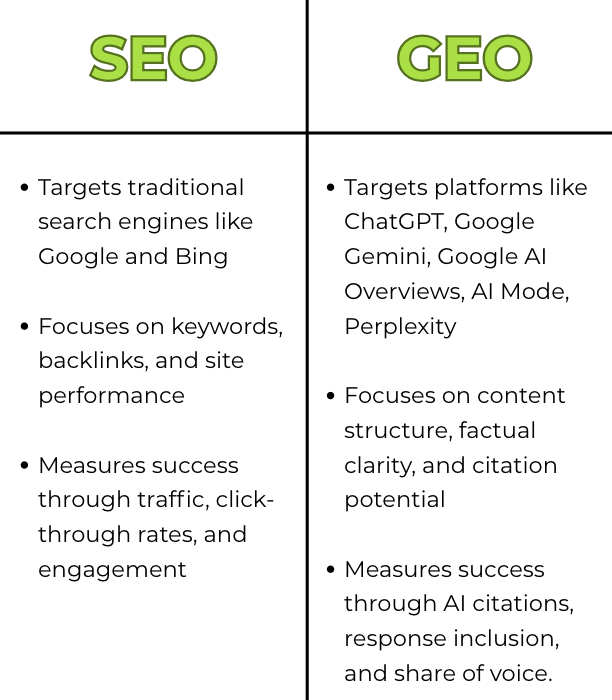 SEO and GEO both aim to increase visibility, but they function in different ways.