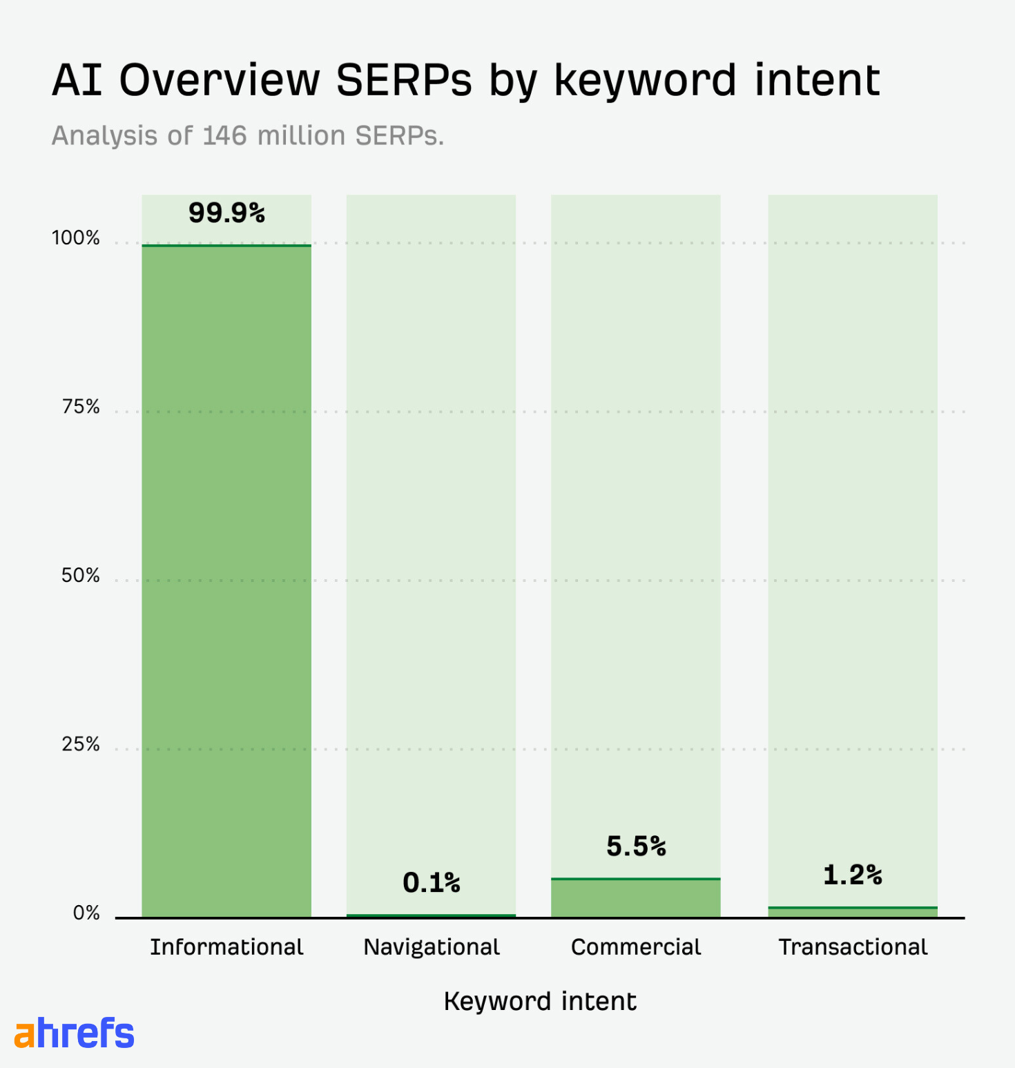 Intent made the biggest difference. The study classified keywords by what the searcher was trying to do. Informational queries made up almost every instance of an AI Overview. Out of all the times a summary appeared, 99.9% were triggered by someone simply trying to learn. By contrast, keywords aimed at buying something or navigating to a specific site almost never brought up AI Overviews. Transactional queries showed a 2.1% rate. Commercial keywords came in at just 4.3%. Navigational terms barely registered at all.