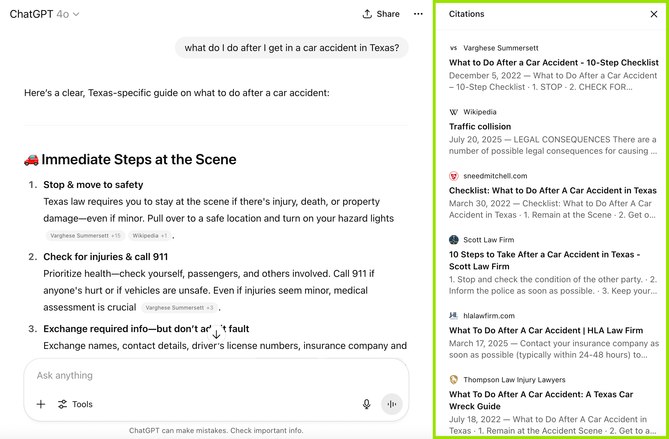 Writing content without taking steps to research appropriately is no longer enough. Publishing something that reflects what people are currently discussing online, using proprietary data that has not yet been widely shared, or offering a unique perspective on a niche subject creates an opportunity to become part of the AI feedback loop. When your content becomes the input, your firm becomes the answer people are asking for. Below is an example showing 5 out of 6 citations are law firm websites with the other citation being Wikipedia.