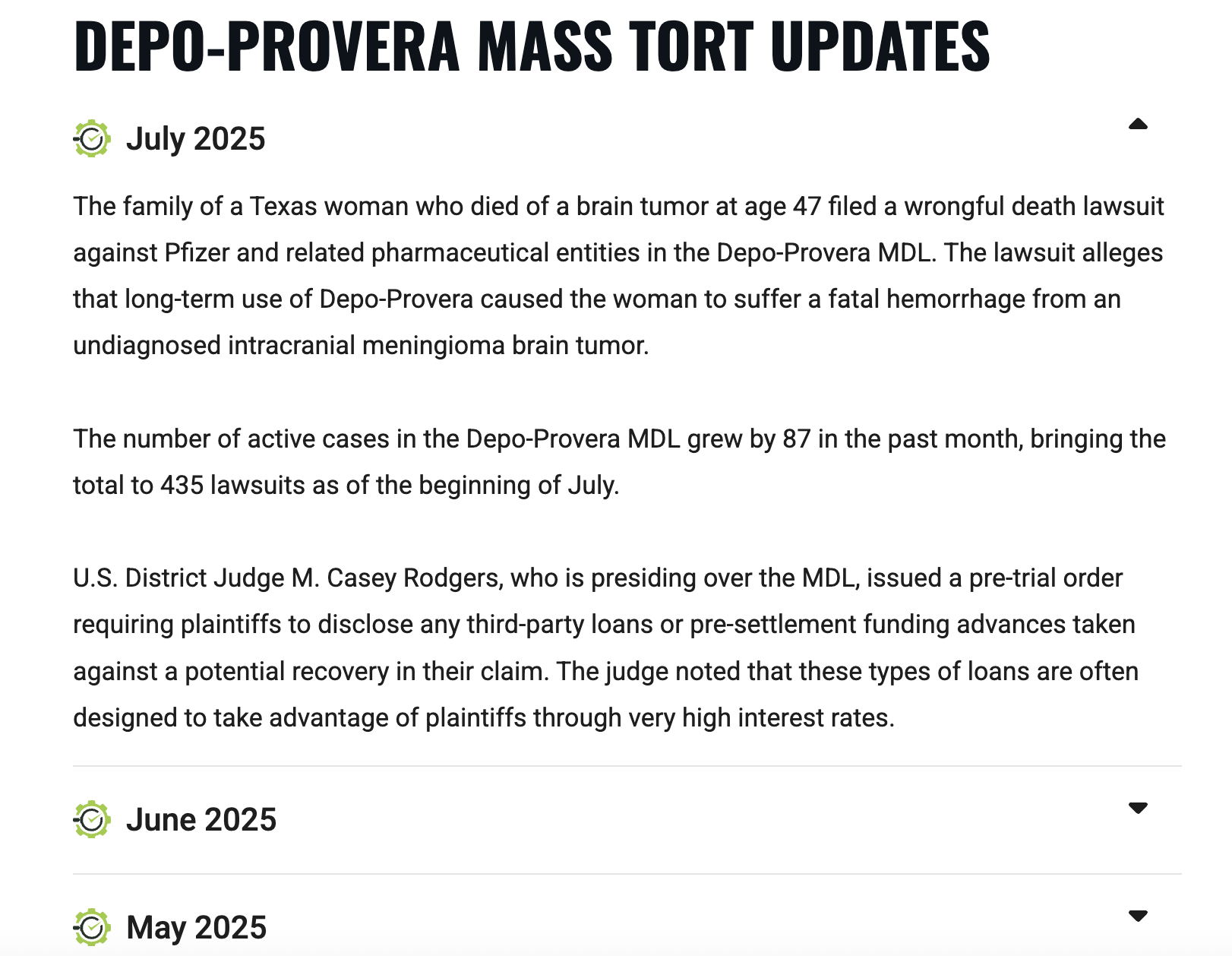 As an example, existing content on your webpage can be updated on a regular schedule to add recency and authority to your site. This, with the right technical optimizations, can make your content more appealing for AI tools as it sees your updates as fresh and valuable. We do this on our website with all of our mass tort litigation pages, such as the Depo Provera Lawsuit Campaigns page.