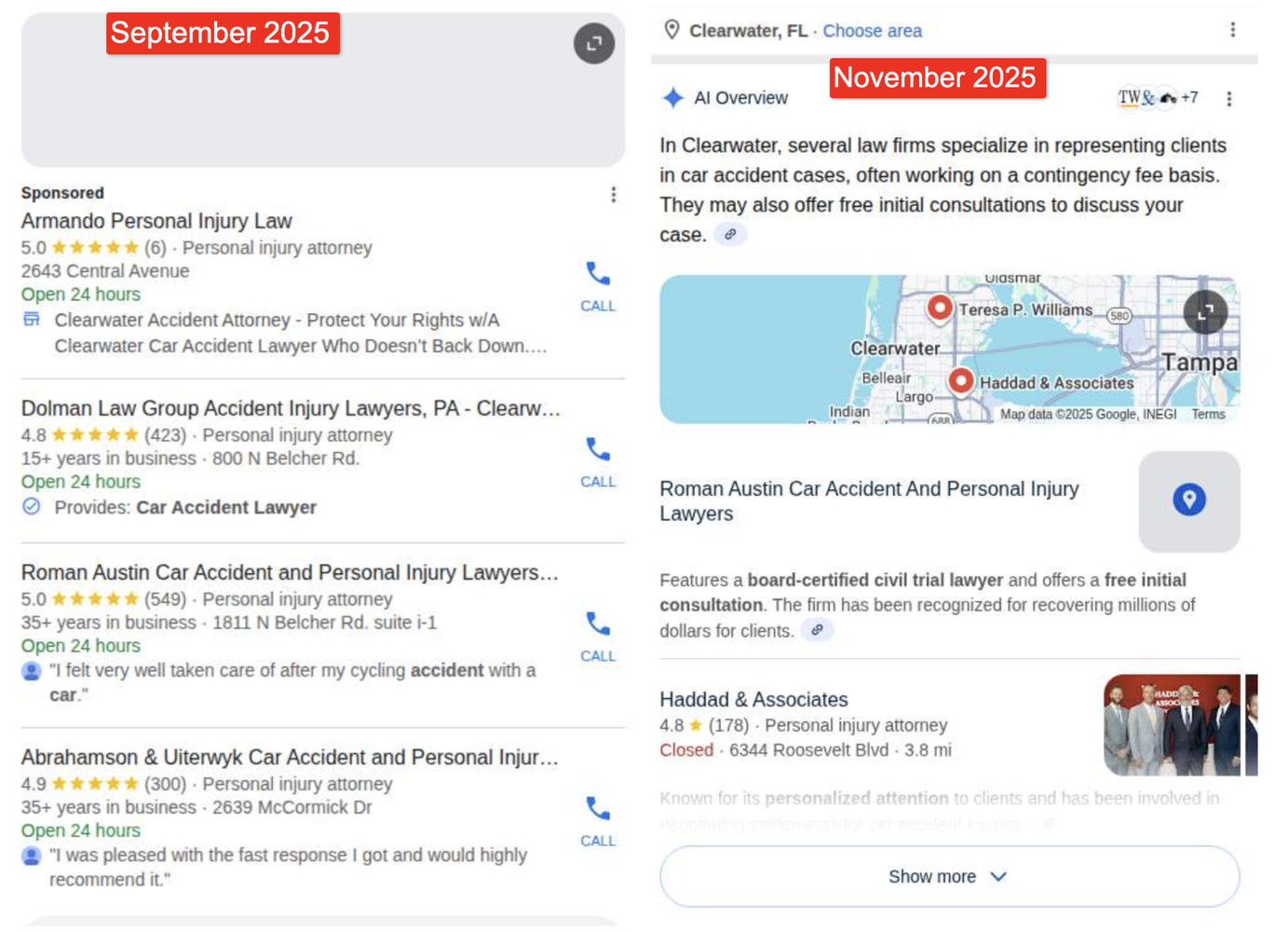 This change increases the cost of staying visible. Firms that have relied on organic performance alone are seeing their traffic diluted. Those that advertise are now forced to compete for map pack space that used to be driven by reputation and local optimization. The rules have changed, and staying competitive requires a different strategy.