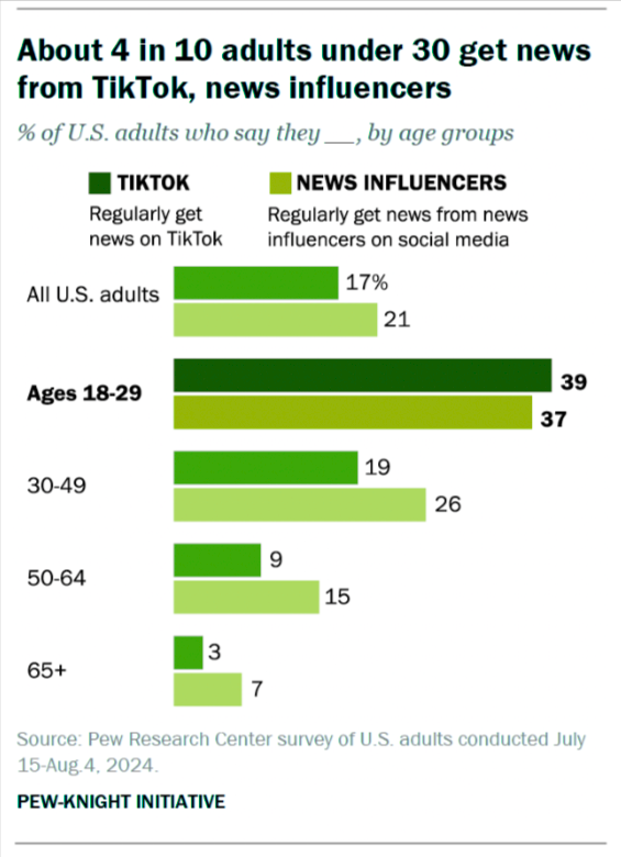 A recent Pew Research study found that 39 percent of U.S. adults under 30 regularly turn to TikTok for news. That percentage now surpasses every other major social platform in the country.